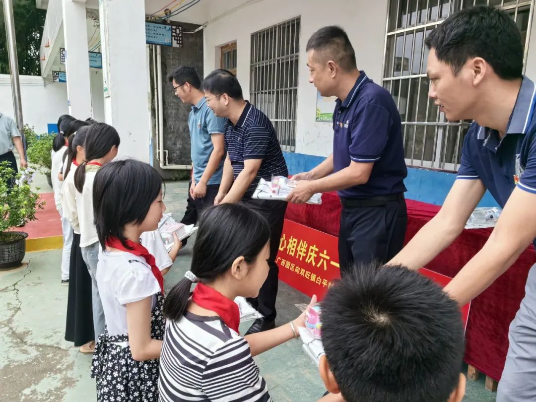 “不管在哪里投資,都要為當(dāng)?shù)亟?jīng)濟(jì)社會(huì)做貢獻(xiàn)”的投資理念,改善鄉(xiāng)村兒童學(xué)習(xí)生活環(huán)境,履行pg國(guó)際的社會(huì)責(zé)任,助力形成全社會(huì)關(guān)心和參與愛(ài)心助學(xué)的氛圍,5月29日上午,華友廣西園區(qū)到周邊的松旺鎮(zhèn)潭蓮村,雙旺鎮(zhèn)白平村、邦杰村、曾村和中心小學(xué)等5所小學(xué)走訪(fǎng)慰問(wèn),廣西區(qū)域管理中心及各產(chǎn)業(yè)集團(tuán)廣西基地干部代表為5所小學(xué)3700多名學(xué)生送上書(shū)包、水杯、馬克筆和筆記本等學(xué)習(xí)用品作為兒童節(jié)禮物。