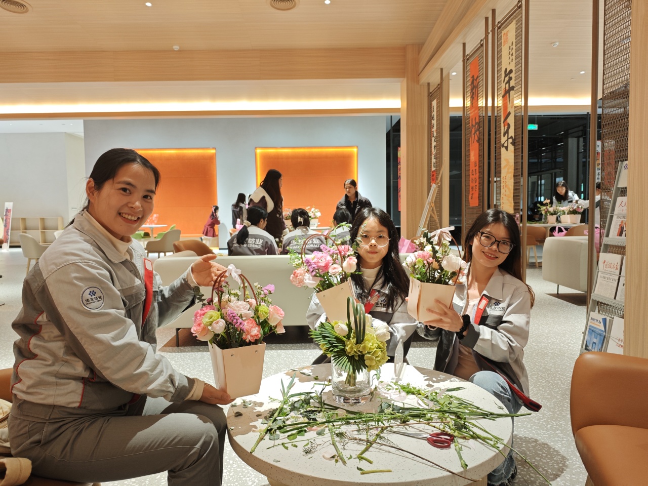 健康講座結(jié)束后,員工們在花藝師指導(dǎo)下進(jìn)行春日主題插花創(chuàng)作。拆開春日花材包的那一刻,商超休閑中心化作花香彌漫的創(chuàng)作空間??的塑暗臏厝帷⒀蠼酃5撵`動、尤加利葉的堅韌…… 每一束花籃都是職場女性多重角色的生動寫照。