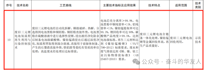 近日,衢州華友資源再生科技有限公司獨(dú)立研發(fā)技術(shù)——廢舊三元鋰電池短流程再生利用與污染控制技術(shù),成功入選“三年一評(píng)選”的2023年度《國(guó)家先進(jìn)污染防治技術(shù)目錄(固體廢物和土壤污染防治領(lǐng)域)》(以下簡(jiǎn)稱《目錄》),三元鋰電回收領(lǐng)域全國(guó)僅兩家入選國(guó)家級(jí)固體廢物污染防治領(lǐng)域示范技術(shù)。