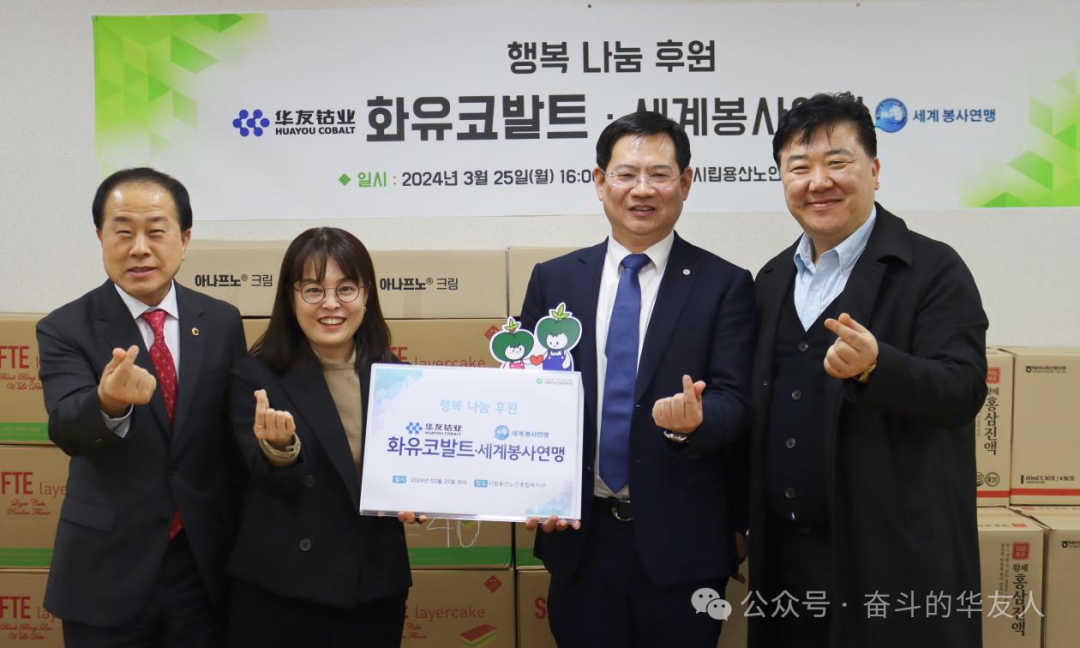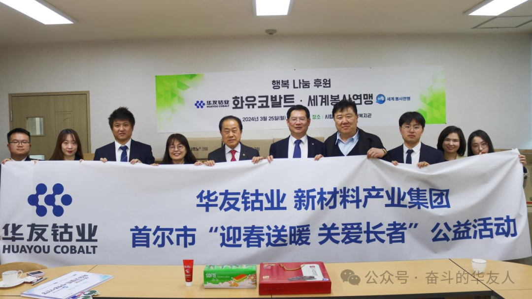 3月25日,華友鈷業(yè)新材料產(chǎn)業(yè)集團(tuán)韓國代表處攜手首爾市議會金榮鎬議員、世界公益聯(lián)盟洪禎雨會長一同前往韓國首爾市立龍山老人綜合福祉館,共同開展“迎春送暖,關(guān)愛長者”公益活動,為長者們送去溫暖和關(guān)懷。
