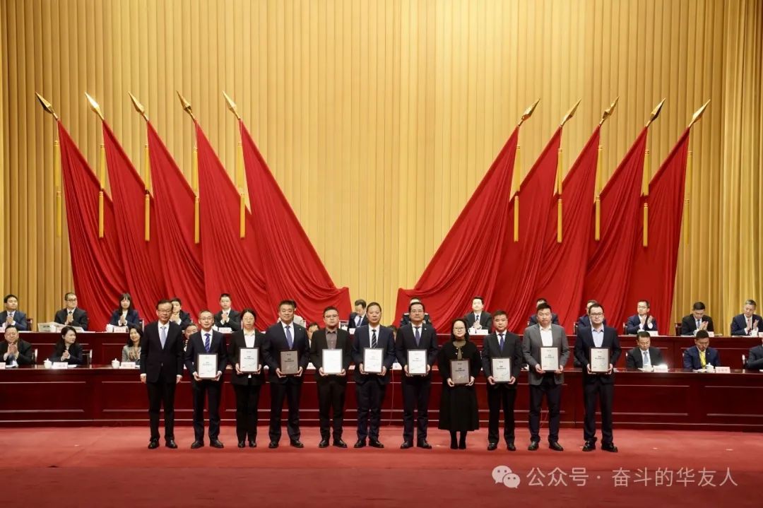 ▲華友鈷業(yè)高級副總裁王軍(右五)代表公司登臺領(lǐng)獎(jiǎng)。