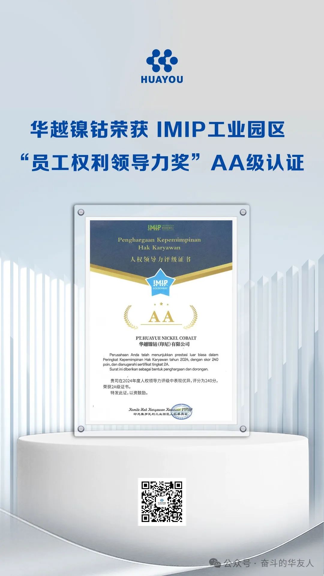 近日,華越鎳鈷(印尼)有限公司憑借卓越的員工管理體系與人權(quán)保障實(shí)踐,在2024 年度 IMIP 印尼莫羅瓦利工業(yè)園區(qū)人權(quán)委員會(huì)組織的員工權(quán)利領(lǐng)導(dǎo)力評(píng)級(jí)評(píng)選中脫穎而出,榮獲 AA 級(jí)認(rèn)證,并取得 240 分的優(yōu)異成績(jī),充分彰顯了公司在人力資源管理及員工權(quán)益保障領(lǐng)域的領(lǐng)先地位。