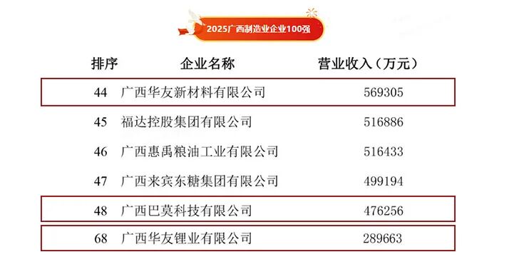 而在更具針對性地反映產(chǎn)業(yè)硬實(shí)力的“廣西制造業(yè)pg國際100強(qiáng)”榜單中,華友廣西園區(qū)優(yōu)勢更為凸顯,其中,廣西華友新材料有限公司位列第44名,廣西巴莫科技有限公司緊隨其后位列第48名,廣西華友鋰業(yè)有限公司排名第68位。