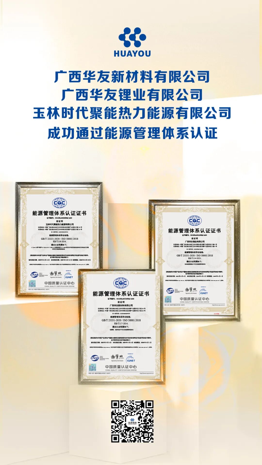 近日,華友鈷業(yè)下屬三家子公司傳來喜訊:廣西華友新材料有限公司、廣西華友鋰業(yè)有限公司及玉林時代聚能熱力能源有限公司,成功通過ISO50001能源管理體系認證。