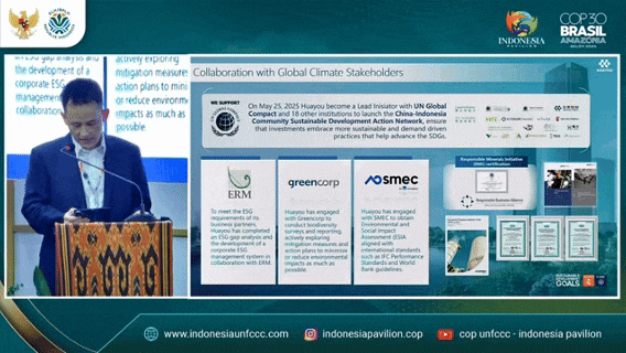 11月10日至21日,《聯(lián)合國(guó)氣候變化框架公約》第三十次締約方大會(huì)(COP30)在巴西貝倫(Belém)舉行。全球約193個(gè)國(guó)家/締約方,逾56000人次參與了本次活動(dòng)。華友作為印尼鎳下游產(chǎn)業(yè)化轉(zhuǎn)型的“核心推動(dòng)者”之一、綠色減碳優(yōu)秀pg國(guó)際代表,受印尼環(huán)境部邀請(qǐng)參加本次活動(dòng),響應(yīng)大會(huì)主題。